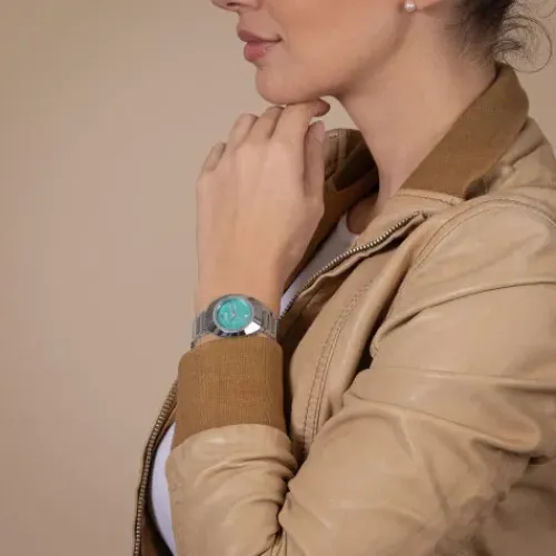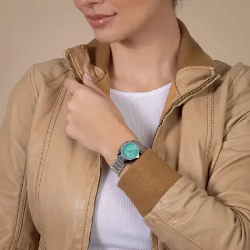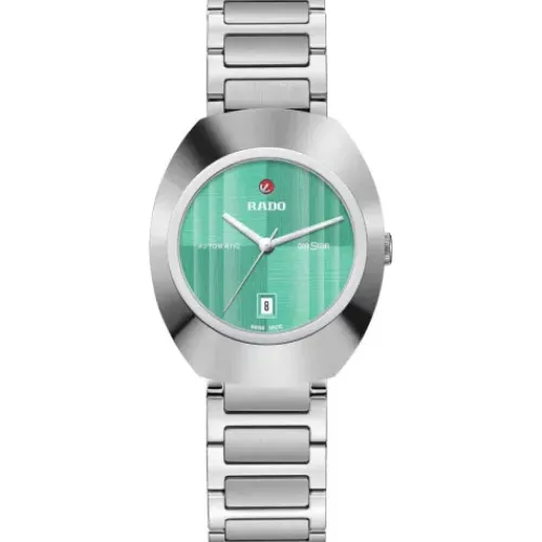 Ein legendäres Symbol für Schweizer Handwerkskunst und bahnbrechende Innovation: Die Rado Diastar wurde für TrägerInnen entworfen, die das Extraordinäre schätzen. Das 30 mm grosse, von einer polierten platinfarbenen Ceramos™ Lünette gekrönte Gehäuse geht nahtlos in ein Mittelgehäuse …aus poliertem Edelstahl über und ist bis zu 10 bar (100 Meter) wasserdicht. Das türkisfarbene, in zwei Richtungen gebürstete Zifferblatt spielt auf elegante Weise mit dem Licht. Highlights sind zudem der legendäre silberfarbene bewegliche Anker und das sorgfältig positionierte Datumsfenster bei 6 Uhr. Rhodiumfarbene Zeiger mit weissem Super-LumiNova® sorgen für eine jederzeit perfekte Ablesbarkeit. Geschützt wird das raffinierte Zifferblatt durch ein vertikal facettiertes Saphirglas mit Antireflexionsbeschichtung auf der Innenseite. Herzstück der Uhr ist ein Automatikwerk vom Kaliber R586. Das in fünf Lagen fein justierte Uhrwerk mit Nivachron™ Spiralfeder bietet eine hohe Ganggenauigkeit und eine Gangreserve von 48 Stunden. Abgerundet wird das Design dieses legendären Zeitmessers durch ein Edelstahlarmband, das Glieder aus poliertem und Mittelglieder aus gebürstetem Edelstahl miteinander kombiniert und durch eine Dreifachschliesse gesichert wird.