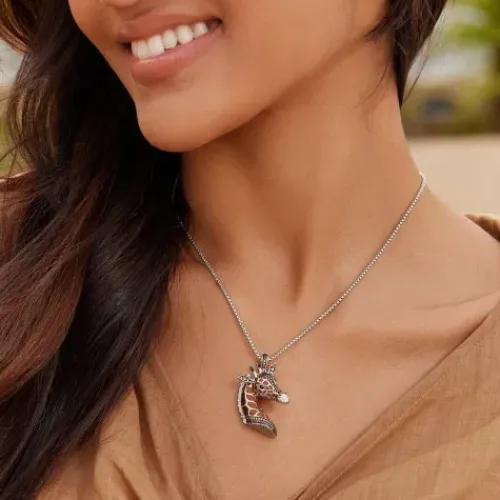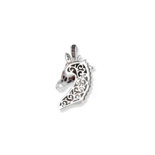 Der Rafa Giraffen Anhänger ist ein Kunstwerk der Eleganz und Raffinesse. Hergestellt aus hochwertigem 925 Sterling Silber und kunstvoll rhodiniert, strahlt dieser Anhänger einen kühlen, zeitlosen Glanz aus, der die markante Schönheit der Giraffe perfekt einfängt. Der Giraffenkopf, als …zentrales Element des Anhängers, wird durch eine bräunliche Emaille präsentiert, die das einzigartige Muster des Giraffenfells auf kunstvolle Weise nachahmt. Jedes Detail wurde mit höchster Präzision gestaltet, um die charakteristische Anmut und Eleganz der Giraffe auf subtile und dennoch beeindruckende Weise hervorzuheben. Die Zirkonia, kunstvoll gefasst und verziert, fügen dem Anhänger einen Hauch von Glamour hinzu und betonen die raffinierte Ästhetik des Designs. Die funkelnden Steine setzen elegante Akzente, die das Gesamtbild des Rafa Giraffen Anhängers zu einem herausragenden Schmuckstück machen. Tragen Sie diesen Anhänger, um Ihre Liebe zur Natur und Ihre Affinität zur exquisiten Ästhetik zu zeigen. Der Rafa Giraffen Anhänger ist nicht nur ein Schmuckstück, sondern ein Statement von Anmut und Eleganz, das Ihren persönlichen Stil auf einzigartige Weise unterstreicht.