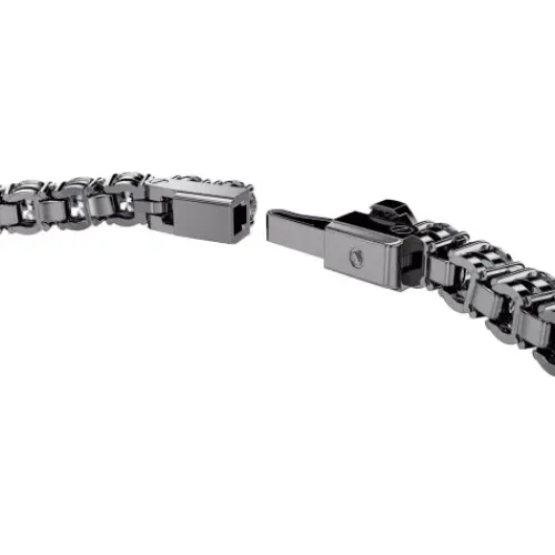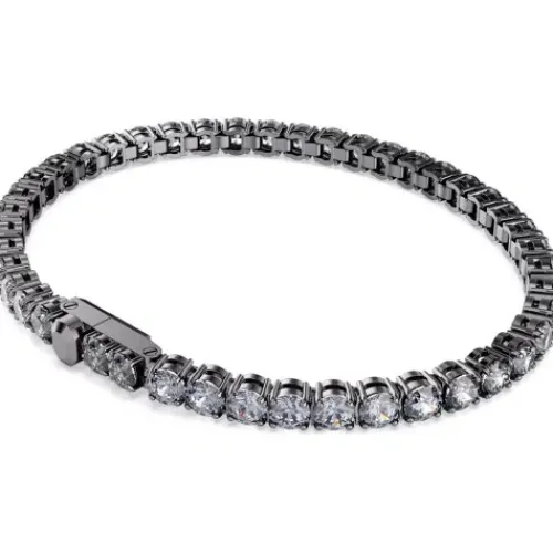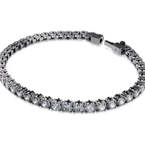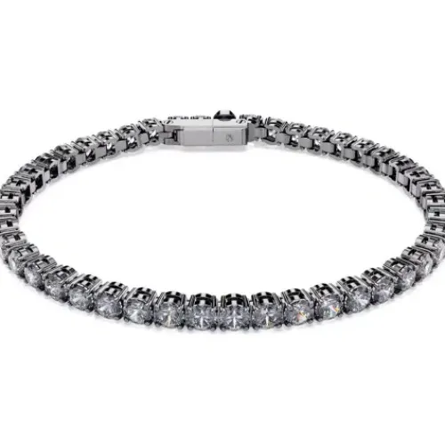 Entdecken Sie die starke Weiterentwicklung des klassischen Tennisarmbands. Das ruthenierte Design besteht rundum aus silbergrauen Swarovski Zirconia und einem Matrix Tennis Verschluss, der sich leicht öffnen und schließen lässt. Dieses auffallende Schmuckstück ist ideal, um Ihrem Styling …glänzende Dramatik zu verleihen, und es zieht die Aufmerksamkeit auf Ihren Look.