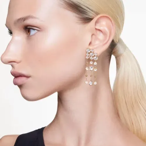Diese dramatisch schimmernden Ohrhänger machen ein klares Style Statement. Die beiden Kreationen in Goldlegierungsschicht präsentieren ein Design mit schwingenden Metalltropfen und kesselgefassten Rundkristallen. Diese Elemente in vielen verschiedenen Größen und Schliffen sorgen für …betörenden Glanz und durchdringen Ihren Look mit brillanter Schönheit.