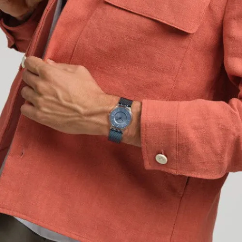 Diese ultraflache Uhr verfügt über ein blaues Sonnenschliff-Zifferblatt mit silberfarbenen Indizes, silberfarbenem Stunden- und Minutenzeiger in einem glänzend-durchsichtigen Gehäuse aus biobasiertem Material mit biobasiertem Glas. Ein verstellbares Mesh-Armband aus Edelstahl mit blauer …PVD-Beschichtung komplettiert den Look dieses minimalistischen Modells.