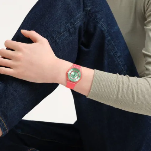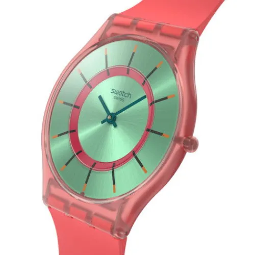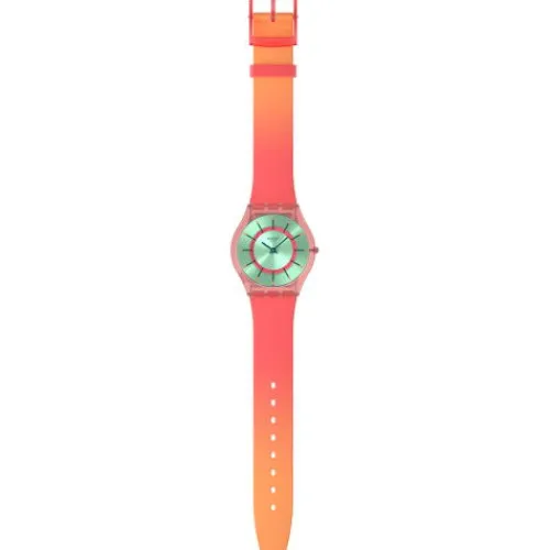 Diese ultraschmale Uhr überzeugt mit ihrem Zifferblatt mit Sonnenschliff. Darauf sieht man einen inneren Ring in dunklem Pink, zweifarbige Stundenmarkierungen in dunklem Grün und Orange sowie dunkelgrüne Stunden- und Minutenzeiger. All dies wird geschützt von biobasiertem Glas. Das …transparente Gehäuse in mattem Pink trifft auf ein Armband mit Farbverlauf von mattem, dunklem Pink zu Orange. Schliesse und Schlaufe sind in mattem, transparenten, dunklen Pink gehalten.