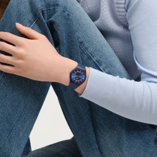 Diese ultraschmale Uhr überzeugt mit ihrem Zifferblatt mit Sonnenschliff. Darauf sieht man einen türkisen inneren Ring, zweifarbige Stundenmarkierungen in Hellblau und Weiss sowie weisse Stunden- und Minutenzeiger. All dies wird geschützt von biobasiertem Glas. Das transparente Gehäuse in …mattem Hellblau besteht aus biobasiertem Glas und trifft auf ein Armband mit Farbverlauf von mattem Dunkelblau zu Türkis. Schliesse und Schlaufe sind in mattem, transparenten Türkis gehalten.