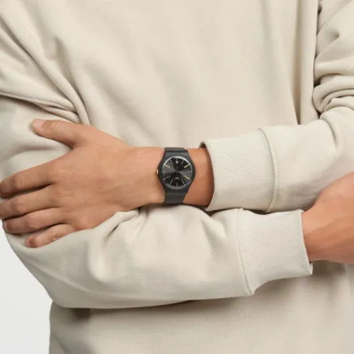 Dieses Modell verfügt über ein schwarzes Zifferblatt mit Sonnenschliff, goldfarbene Indizes, schwarze Stunden- und Minutenzeiger, die im Dunkeln leuchten, und ein biobasiertes Gehäuse und Glas. Abgerundet wird das unverwechselbare Design dieser Uhr durch ein mattschwarzes biobasiertes Armband …mit farblich abgestimmter Schlaufe und Schliesse.