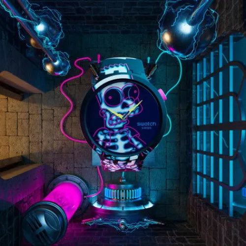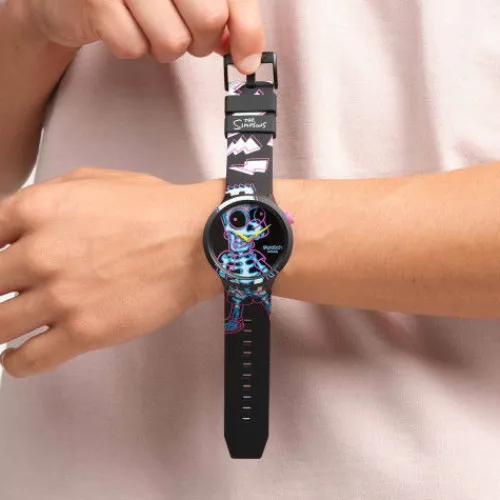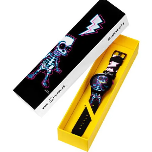 Als durchgehender Print auf Zifferblatt, Lünette und Armband dieser gruseligen mattschwarzen Uhr aus der Simpsons-Kollektion ist in mehreren Farben das unter Strom stehende Skelett von Bart Simpson zu sehen. Gelbe blitzförmige Stunden- und Minutenzeiger und ein silberfarbener Sekundenzeiger …zeigen die Zeit an. Das Armband ist mit mattschwarzen Schlaufen und einer ebenfalls mattschwarzen Schliesse ausgestattet. Auf der unteren Schlaufe ist in Weiss das The Simpsons-Logo aufgedruckt.