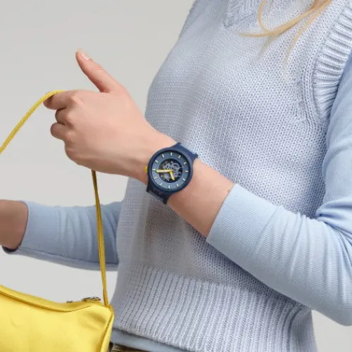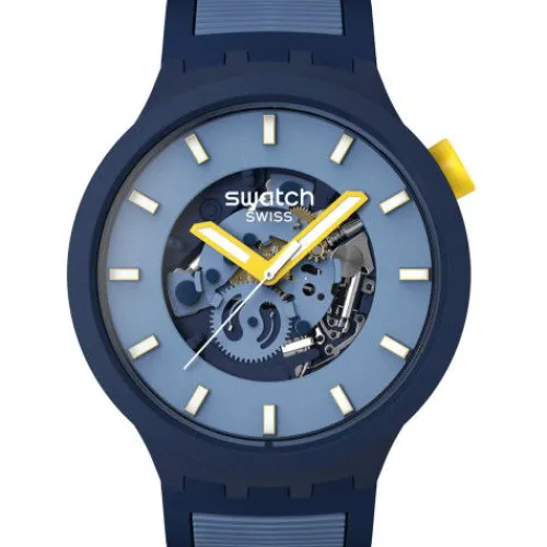 Diese übergrosse Uhr besticht durch ihr hellblaues, offenes Zifferblatt mit weissen und gelben 3D-Indizes, gelbem Stunden- und Minutenzeiger mit fluoreszierendem Effekt, weissem Sekundenzeiger und hellblauen Uhrwerkselementen unter biobasiertem Uhrenglas. Komplettiert wird das biobasierte …Gehäuse in Mattdunkelblau mit farblich passender Lünette durch ein mattdunkelblaues Armband mit matthellblauer Struktur, mattdunkelblauen und matthellblauen Schlaufen und einer Schliesse in Mattdunkelblau.