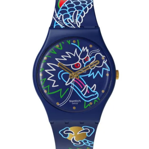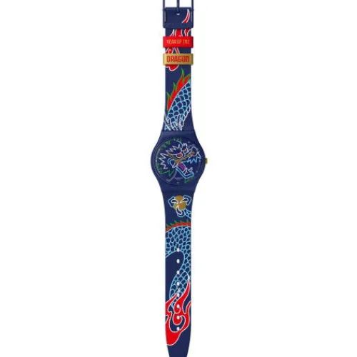 Dieses Modell mit Drachen-Motiv verfügt über ein blaues Zifferblatt mit mehrfarbigem Druck, eingeschlossen in einem dunkelblauen biobasierten Gehäuse und Glas. Das farblich abgestimmte blaue Armband mit mehrfarbigem Druck ist zudem mit roten und goldfarbenen bedruckten Schlaufen und einer …blauen Schließe ausgestattet.