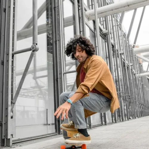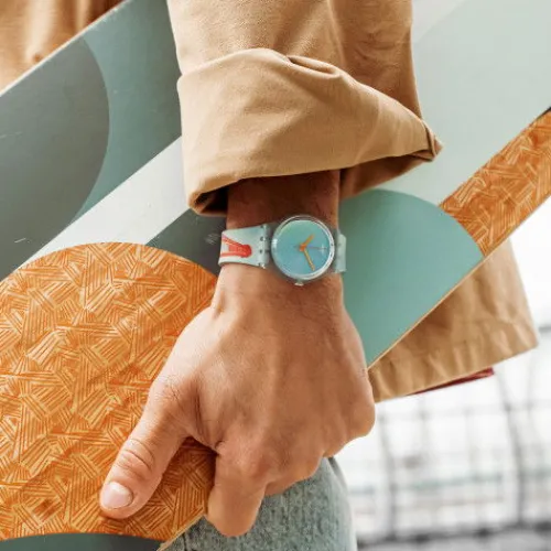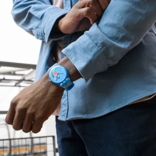 Dieses Gent-Modell aus der Kunstkooperation von Swatch ist dem Gemäldeklassiker „La Tour Eiffel“ von Robert Delaunay gewidmet, vor allem dessen besonderen Blickwinkel von unten nach oben. Der mehrfarbige Allover-Print dieser Uhr aus der Swatch X Centre Pompidou-Kollektion kontrastiert zum …halbtransparenten, matthellblauen Silikonarmband, dem transparenten, matthellblauen Plastikgehäuse und dem silberfarbenen Zifferblatt, wobei er die leuchtenden Farben des Originals perfekt widerspiegelt.
