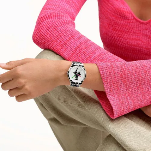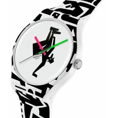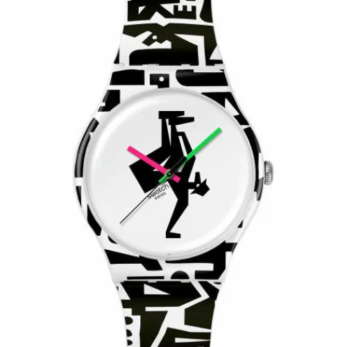 Diese lustige Uhr wurde in Zusammenarbeit mit dem Künstler und Grafikdesigner Grotesk kreiert. Das weisse Zifferblatt mit schwarzem Print unter biobasiertem Glas ist mit einem pinkfarbenen Stundenzeiger, einem grünem Minutenzeiger und einem schwarzen Sekundenzeiger ausgestattet. Das schwarze …Design ist quer über das mattweisse Armband, die Schlaufe und das biobasierte Gehäuse gedruckt. Abgerundet wird das Modell mit einer Schliesse in mattem Weiss.