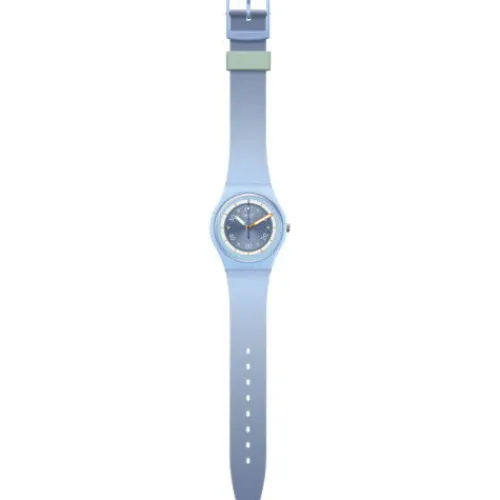Dieses stilvolle Modell in Blautönen verfügt über ein blaues Zifferblatt mit einem Aufdruck in Weiss, Orange und Grün und fluoreszierenden Details. Das Gehäuse ist aus hellblauer BIOCERAMIC gefertigt und mit einem biobasierten Glas ausgestattet. Der grüne Stundenzeiger, der orangefarbene …Minutenzeiger und der blaue Sekundenzeiger leuchten im Dunkeln. Die mattgrüne Schlaufe am Armband mit Farbverlauf in Mattblau hebt die Details auf dem Zifferblatt hervor.