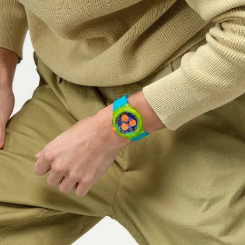 Dieser neonfarbene Chronograph ist von einer Swatch CHRONO aus den 90er Jahren inspiriert: der NEO WAVE (SCJ100). Das mehrfarbige Zifferblatt mit Tachymeterskala trumpft mit fluoreszierenden schwarzen Stunden- und Minutenzeigern, einem orangefarbenen Sekundenzeiger und einem Datumsfenster bei 3 …Uhr auf. Das matt-transparente gelbe Gehäuse ist mit einer farblich abgestimmten Lünette ausgestattet. Das türkisfarbene Armband mit Struktur wird durch farblich abgesetzte Schlaufen in matt-transparentem Gelb und Orange sowie einer Schließe in matt-transparentem Blau akzentuiert.