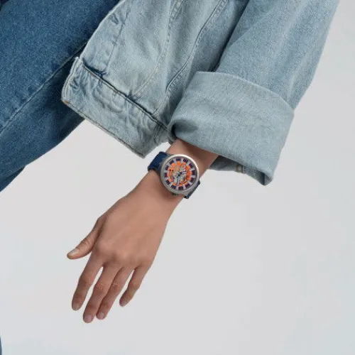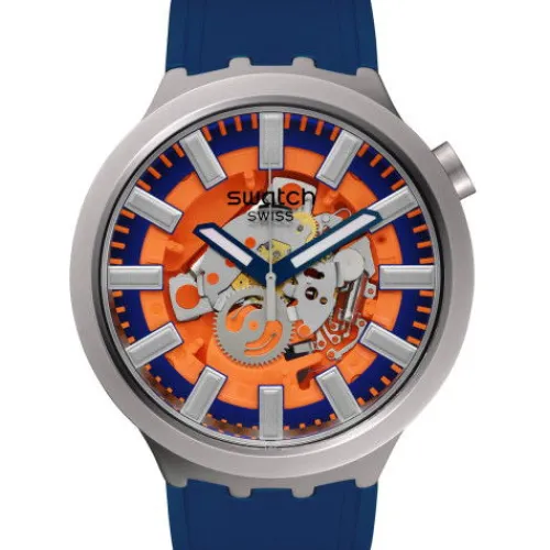 Diese übergroße Uhr hat ein dunkelblaues offenes Zifferblatt mit orange-silberfarbenem Print. Gehäuse und Lünette si…