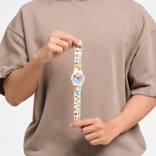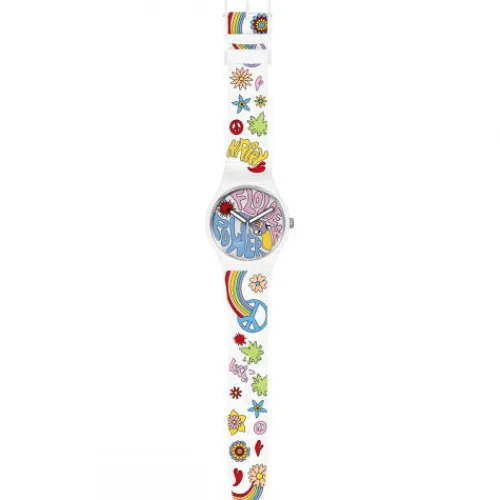 Die Botschaft der floralen Uhr im Stil der ‘60er Jahre ist klar und deutlich: Frieden und Liebe. Sie hat ein weißes BIOCERAMIC-Gehäuse mit biobasiertem Kunststoffglas, ein weisses Silikonarmband, bunt gemustert mit Blumen- und Symbolen, sowie ein weisses Zifferblatt mit Multicolor-Schriftzug …im Retrostil und fluoreszierenden Zeigern.