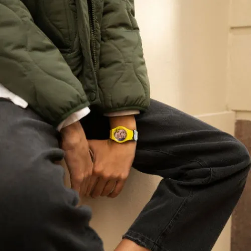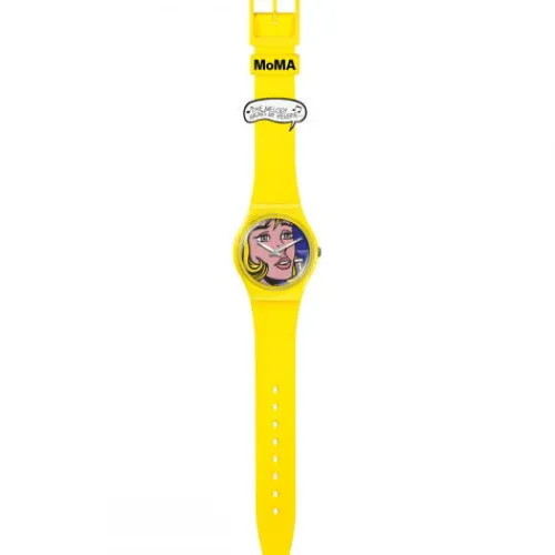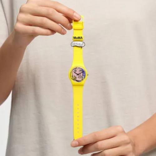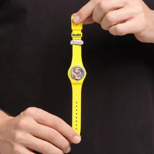 REVERIE BY ROY LICHTENSTEIN, THE WATCH reproduziert Roy Lichtensteins Reverie, wobei das Zifferblatt mit einem Detail des Pop Art Werks bedruckt ist. Das mattgelbe Armband mit bedruckten Schlaufen und passendem, biobasierten Gehäuse vervollständigen das mehrfarbige Zifferblatt aus der Swatch x …MoMA-Partnerschaft.©2023 The Museum of Modern Art. The Museum of Modern Art, MoMA, and related logos are Trademarks of The Museum of Modern Art. © 2023 Estate of Roy Lichtenstein. Roy Lichtenstein™