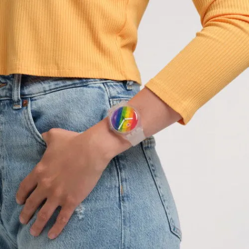 Die NEW GENT BIOSOURCED-Uhr mit Regenbogenflagge hat ein halbtransparentes Zifferblatt mit mehrfarbigem Print und einem biobasierten Uhrglas. Das Kalenderrad zeigt im 24 Stunden-Takt ein neues LGBTQIA2S-Symbol. Ein matt-transparentes, farbloses, biobasiertes Gehäuse auf einem halbtransparenten, …matten Silikonarmband runden die PRIDE WATCH perfekt ab. Sie wird zusätzlich zur regulären Verpackung mit einem Regenbogenband geliefert.