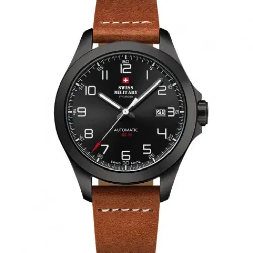 Die Werte der schweizer Uhrmacherkunst im Inneren, gepaart mit dem modernen militärischen Charakter im Äusseren, ergeben diese hochwertige Automatikuhr für Herren. Der Clou dieser modernen Herrenuhr mit markanter Attitüde liegt in der Kombination aus dem klassischen runden Gehäuse und dem …auffälligen Zifferblatt. Die klassischen arabischen Ziffern und die modernen Zeiger bilden einen perfekten Gegenpol zum elegant schimmernden Sunray-Zifferblatt. Das Lederarmband im Vintage-Stil mit weißen Nähten unterstreicht den modernen Charakter dieser Schweizer Uhr. Es ist eine Kombination, die begeistert.