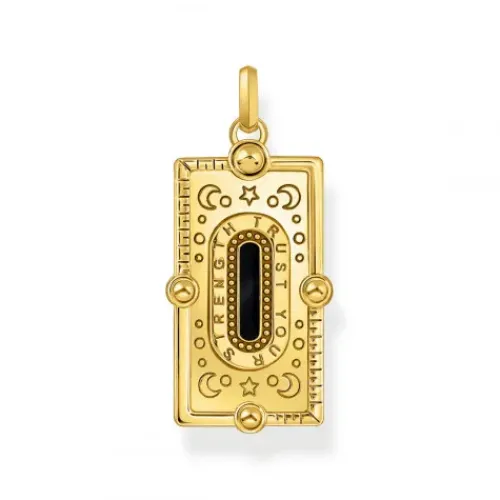 Die Rückseite ist mit feinen Gravurlinien, erhabenen Dots, gravierten Monden und Sternen sowie TRUST YOUR STRENGTH als Gravur detailreich gestaltet. Ein ovaler Cut-out in der Mitte lässt die schwarze Kaltemaille auf der Rückseite hindurchscheinen. Individuell ist das ausdrucksstarke Schmuckstück mit einer Kette aus dem Portfolio von THOMAS SABO kombinierbar.