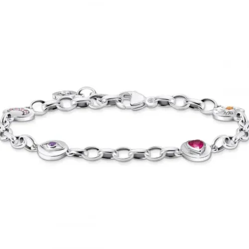 Kosmische Talismane: Das Armband besteht aus hochwertigem, leicht geschwärztem 925er Sterlingsilber und ist im Gliederketten-Stil gestaltet. Highlights sind vier runde Elemente, die mit den Symbolen Halbmond, Auge, Herz und Sonne graviert sind. Diese sind mit Steinen in unterschiedlichen Farben …besetzt.