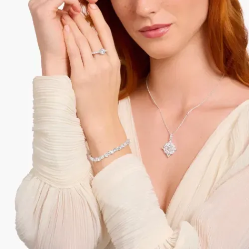 Mit einem Verlängerungskettchen versehen, kannst du das Tennisarmband zwischen 16 und 19 cm in seiner Länge variieren. An seinem Ende funkelt ein aufwendiger, steinbesetzter Anhänger.