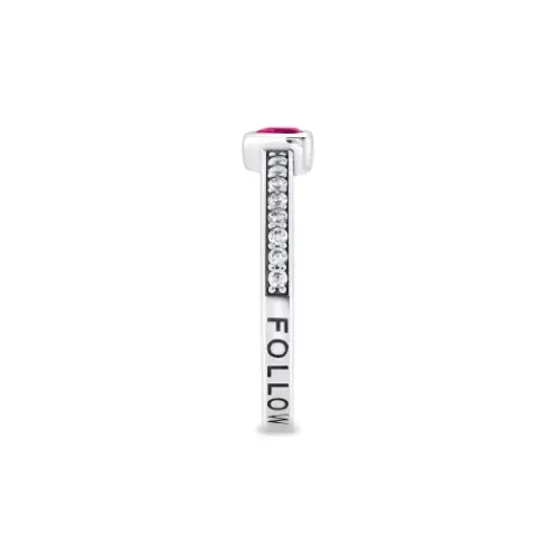 Aus recyceltem, leicht …geschwärztem Silber gefertigt, ist der Ring zur Hälfte mit weißen Zirkonia-Steinen von Hand besetzt. Auf der Unterseite der Ringschiene ist FOLLOW YOUR HEART graviert.