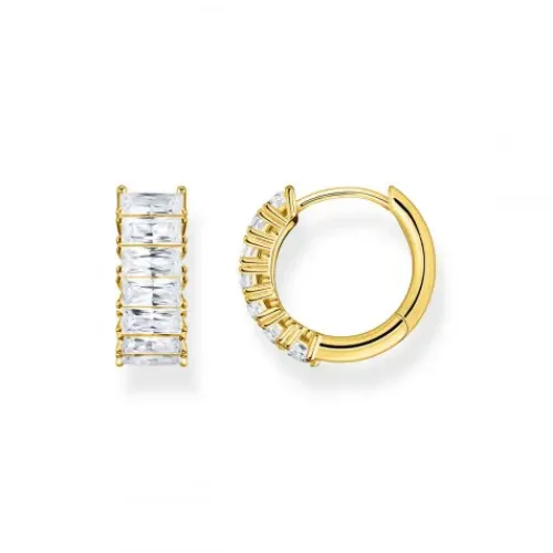 Elegantes Design ist zeitlos: stilvolle, steinbesetzte Creolen mit hochwertiger 750er Gelbgold-Vergoldung. Die handgesetzten 14 weißen Zirkonia erstrahlen im edlen Baguetteschliff. Die offene Krappenfassung macht das Farbenspiel der Steine bei Lichteinfall besonders intensiv. Vielfältig …kombinierbar mit weiteren Schmuckstücken aus dem THOMAS SABO Portfolio.