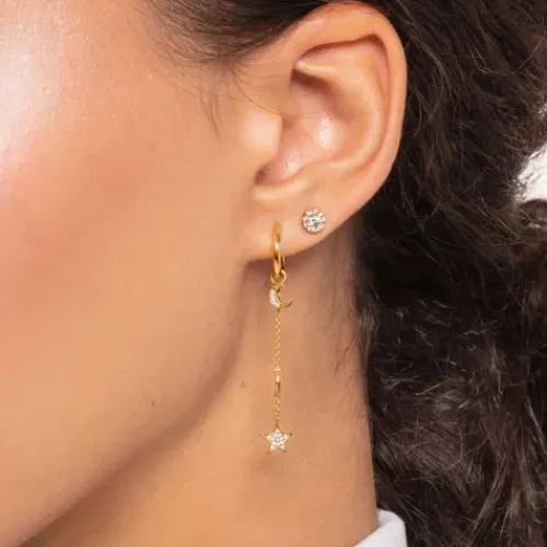 Die Single-Creole ist im perfektionierten Minimalismus aus 925er Sterlingsilber gestaltet und mit einer glänzenden 750er Gelbgold-Vergoldung veredelt. Sie hat einen äußeren Durchmesser von 12 mm und kann individuell mit dem Ohrring-Anhänger kombiniert werden. Dieser begeistert mit seinem …Mond-Design und weißen, funkelnden Zirkonia-Steinen. Er besteht ebenfalls aus 925er Sterlingsilber und ist mit einer hochwertigen 750er Gelbgold-Vergoldung versehen. Mithilfe einer Öse lässt er sich ganz einfach in die Creole einhängen. Diese hat einen inneren Durchmesser von 2,5 mm.