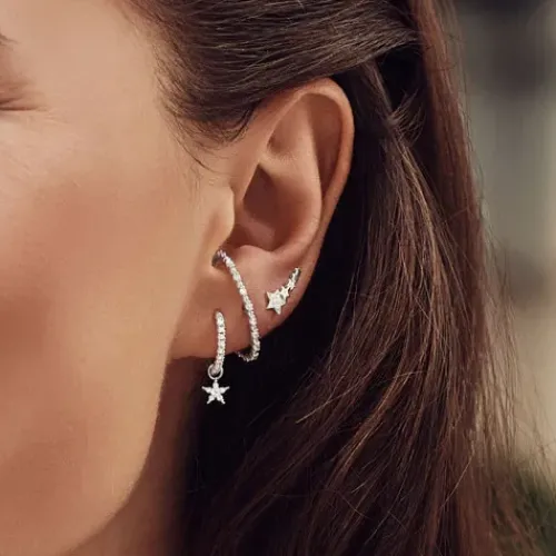Classic Must-have: Die Single-Creole aus purem 925er Sterlingsilber ist auf der Vorderseite mit facettierten, weißen Zirkonia-Steinen im French Setting verziert. Sie hat einen äußeren Durchmesser von 12 mm und lässt sich nach Belieben mit dem Stern-Anhänger kombinieren. Dieser ist im Set …inklusive und lässt sich ganz einfach in die Creole einhängen. Die dafür vorgesehene Öse hat einen inneren Durchmesser von 2,5 mm. Der Ohrring-Anhänger ist ebenfalls aus 925er Sterlingsilber gestaltet und mit weißen Zirkonia-Steinen besetzt.