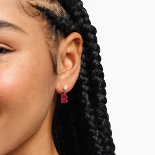 Der Stecker dieser Ohrringe ist mit kleinen, weißen Zirkonia-Steinen besetzt und setzt die Gummibärchen-Anhänger gekonnt in Szene.