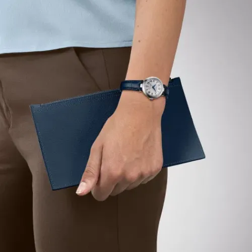 Die Tissot Bellissima Automatic ist die „grosse Schwester“ der Tissot Bellissima Small Lady, besticht wie diese durch ihr edles Design und schöne Details und zeigt sich mit einem immer noch sehr femininen Gehäusedurchmesser von 29 Millimetern geringfügig grösser. Dieses Modell besitzt ein …Swiss Made Automatikwerk mit patentierter, amagnetischer Nivachron-Spirale und bis zu 48 Stunden Gangreserve, kratzfestes, gewölbtes und entspiegeltes Saphirglas sowie einen gläsernen Gehäuseboden. Römische Ziffern, gebläute Zeiger, die kleine Datumsanzeige bei 6 Uhr und nicht zuletzt der blaue Cabochon auf der Krone verleihen der Tissot Bellissima Automatic eine elegante Optik. Ihr weisses Zifferblatt wird von einem 316L-Edelstahlgehäuse umschlossen, und das blaue Lederarmband sitzt dank seiner Butterfly-Faltschliesse mit Drückern ebenso sicher wie gefällig am Handgelenk.
