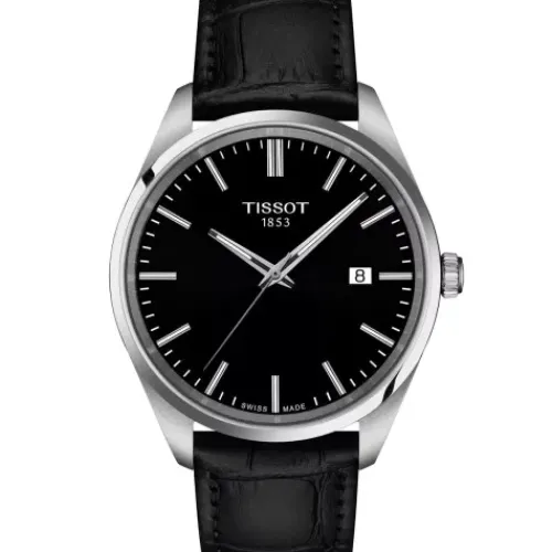 Dieses Tissot PR 100 Quartz 40mm Modell verfügt über ein 40 Millimeter messendes 316L-Edelstahlgehäuse und ein schwarzes Zifferblatt mit Stabindizes und Datumsanzeige. Letzteres liegt gut geschützt unter kratzfestem Saphirglas. Das weiche, flexible Lederarmband in Schwarz erlaubt dank Schnellwechselsystem einen einfachen, werkzeuglosen Austausch. Es besitzt eine Dornschließe.