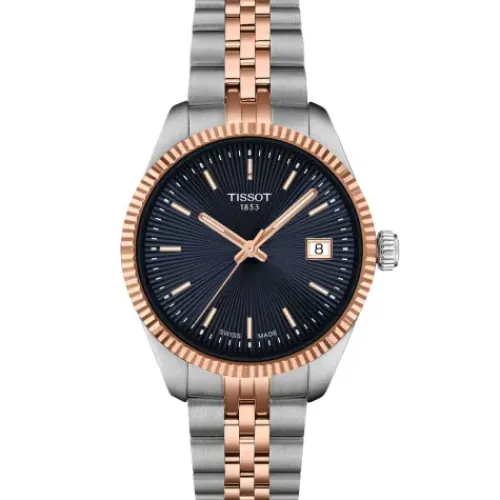 Diese Ausführung der Tissot Ballade 34mm besitzt ein 34 mm messendes 316L-Edelstahlgehäuse in Bicolor mit roségoldfarbener PVD-Beschichtung. Kratzfestes, entspiegeltes Saphirglas liegt schützend über dem dunkelblauen Zifferblatt, das über eine Datumsanzeige bei 3 Uhr verfügt. Roségoldfarbene Zeiger und Indizes heben sich kontrastreich vom Zifferblatt ab, und ihre SuperLuminova® Leuchtbeschichtung gewährt beste Ablesbarkeit.