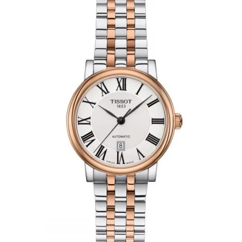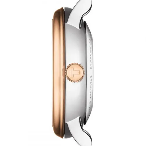 Durch ihr puristisches Design, ihre Stilsicherheit und die schmeichelhaften Veredelungen wird die Tissot Carson Premium Automatic Kollektion immer perfekt sein. Als „Innovator by Tradition“ fügt Tissot dem die Anerkennung und Kraft seines Namens hinzu, der international für die Qualität …seiner Swiss Made Produkte gerühmt wird. Die Tissot Carson Lady verführt durch ihre sanften und klassischen Kurven, die sie zu einem unverzichtbaren Accessoire machen. Sie passt zu allen Styles, allen Anlässen und allen Lebensphasen. Das Gehäuse mit 30 mm und die eleganten Armbänder aus 316L-Edelstahl oder Leder machen die Uhr zu einem schönen Hingucker. Ihr Zifferblatt besteht aus einem äußeren, satinierten Bereich sowie einem zentralen Kreis in der Mitte des Zifferblatts, welches mit feinen, kreisförmigen Strichen das Licht einfängt. Ihr Automatikuhrwerk wurde aufgrund seiner Zuverlässigkeit und hohen uhrmacherischen Qualität ausgewählt. Es weiß ebenso sich unauffällig zu verhalten wie sich über den Sichtboden ihrer Besitzerin ins Gedächtnis zu rufen. Zu den Merkmalen dieser Damenuhr gehören ein Swiss Made Automatikwerk, ein kratzfestes Saphirglas mit Entspiegelungsbeschichtung, ein 316L – Edelstahlgehäuse mit rosegoldfarbener PVD-Beschichtung sowie eine Datums-Anzeige. Das silberfarbene Zifferblatt hat römischen Ziffern. Das 316L-Edelstahlarmband mit rosegoldfarbener PVD-Beschichtung besitzt eine Butterfly-Faltschließe mit Drückern.