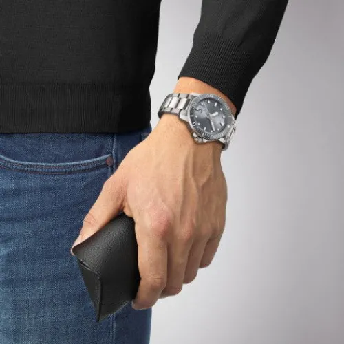 Die Tissot Seastar 1000 Automatic Uhr ist die perfekte Wahl für Taucher. Sie beeindruckt durch ihre Hochleistungsfähigkeit bis zu einem Druck von 30 bar (300 m / 1000 ft), lumineszierenden Zeigern und Indizes sowie der einseitig drehbaren grauen Keramik-Taucherlünette. Mit dieser Uhr können …Sie sich mutig in die Tiefe wagen, sie wird Sie nicht fallenlassen. Diese Uhr der Seastar 1000 Automatic Kollektion ist mit einem Swiss Made Powermatic 80 Werk, kratzfestem Saphirglas, einem 316L – Edelstahlgehäuse sowie verschraubter Krone und verschraubtem Gehäuseboden ausgestattet. Dieses Modell hat ein massives 316L-Edelstahlarmband mit Sicherheitsfaltschließe und Taucherverlängerung sowie ein graues Zifferblatt mit Indizes. Zudem verfügt die Uhr über eine Datumsanzeige und über einen Sichtboden