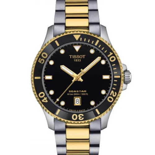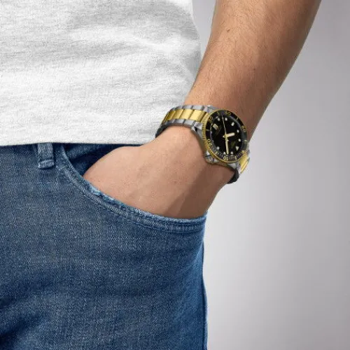 Dieses Tissot Seastar 1000 40mm Modell besitzt eine Bicolor-Lünette, schwarz und am Rand umlaufend mit gelbgoldfarbener PVD-Beschichtung versehen. Ebenfalls gelbgoldfarben präsentieren sich die auf der Lünette abgetragenen Ziffern und Markierungen sowie die Zeiger und Indexe. Auch das Bicolor-Armband aus 316L-Edelstahl besitzt eine gelbgoldfarbene PVD-Beschichtung und ist mit einem Schnellwechselsystem sowie mit einer Faltschließe mit Sicherung und Drückern ausgestattet.