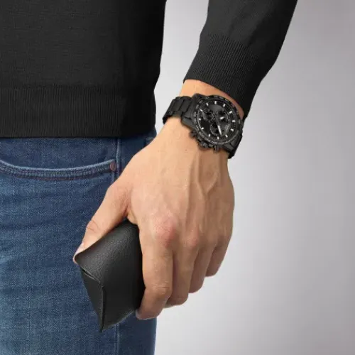 Die Tissot Supersport Chrono Kollektion ist perfekt für den modernen Gentleman, der seine Uhr im Alltag, Büro sowie bei sportlichen Ereignissen tragen möchte. Die geraden Linien und scharfen Kanten in Kombination mit dem 45,5 mm Gehäuse verleihen der Tissot Supersport Chrono eine starke …Persönlichkeit. Die massiven Indizes mit SuperLuminova® Beschichtung sowie die asymmetrischen Applikationen auf dem Zifferblatt sorgen für einen kraftvollen 3D-Effekt, ein dynamisches Erscheinungsbild und ermöglichen eine beeindruckende Lesbarkeit bei Dunkelheit. Alle Modelle des Tissot Chrono Supersport haben ein massives 316L- Edelstahlgehäuse, kratzfestes Saphirglas und besitzen eine Wasserdichtigkeit bis zu einem Druck von 10 bar (100 Metern/330 Fuß). Diese Ausführung der Tissot Supersport Chrono besitzt ein Swiss-Made Quarzwerk sowie ein 316L-Edelstahlgehäuse mit schwarzer PVD-Beschichtung. Das schwarze Zifferblatt mit Indizes und Datumsanzeige ist farblich abgestimmt auf das massive 316L-Edelstahlarmband mit schwarzer PVD-Beschichtung mit Sicherheitsfaltschließe und Taucherverlängerung.