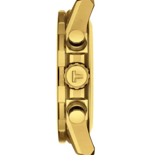 Diese Ausführung der Tissot Supersport Chrono verfügt über ein Swiss Made Quarzwerk und ein 316L-Edelstahlgehäuse mit gelbgoldfarbener PVD-Beschichtung und schwarzem Aluminium-Lünettenring. Von dem schwarzen Zifferblatt mit Datumsanzeige setzen sich gelbgoldfarbene Zeiger und Indizes kontraststark ab. Das 316L-Edelstahlarmband, ebenfalls mit gelbgoldfarbener PVD-Beschichtung versehen, ist mit einem Schnellwechselsystem sowie einer Sicherheits-Faltschließe mit Taucherverlängerung ausgestattet.