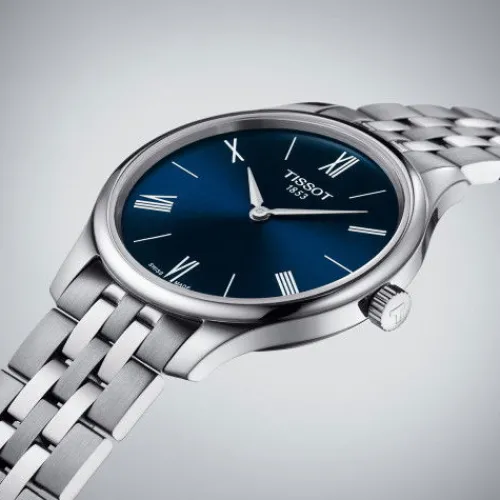 Die Tissot Tradition Familie verleiht der hochmodernen Uhrmacherkunst einen wohl begründeten Hauch Nostalgie, indem sie die heutige Technologie in ein stilvoll traditionelles Design kleidet. Hightech-Bedienung paart sich in perfekter Ausgewogenheit mit klassischen Details und subtilen, …nostalgisch anmutenden Ausführungen. Abgerundet werden diese Kreationen mit Designelementen wie der Guilloche-Verzierung und sanft gebogenen Gehäusen. Die Tissot Tradition verspricht ihren Trägern endlose Stunden präziser Zeitmessung in zeitlosem Design. Die neue Tissot Tradition 5.5 besitzt ein flaches Gehäuse mit einer Höhe von nur 5.5 mm und ist in verschiedenen Gehäusegrößen verfügbar. Dieses Model mit einem Gehäusedurchmesser von 31 mm besitzt ein Swiss Made Quarzwerk sowie kratzfestes Saphirglas. Diese Uhr aus der Tissot Tradition Serie hat ein 316L-Edelstahlgehäuse und ein 316L-Edelstahlarmband mit Butterfly-Faltschließe mit Drückern. Das blaue Zifferblatt mit römischen Ziffern rundet die klassische Optik ab.