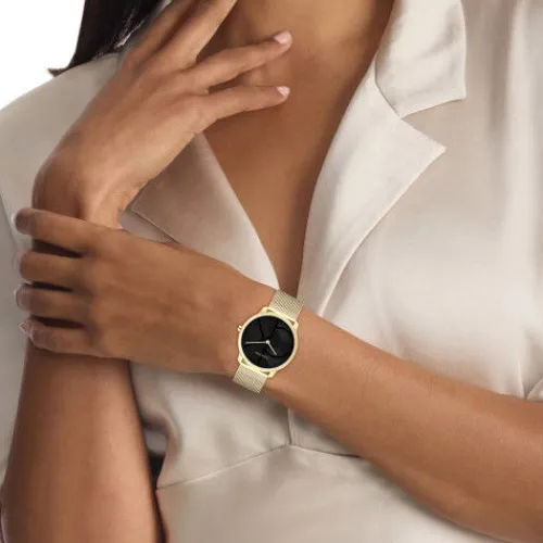 Die Calvin Klein Iconic Uhr vereint luxuriöse Materialien mit einem ausdrucksstarken Design. Das 35 mm grosse, goldfarbene Edelstahlgehäuse umschliesst ein tiefschwarzes Zifferblatt, auf dem das prägnante CK-Logo …prominent zur Geltung kommt. Diese Kombination verleiht der Uhr eine unverwechselbare und edle Ausstrahlung.