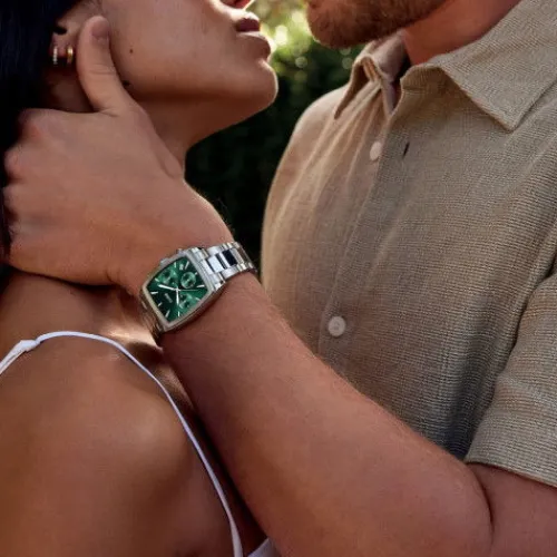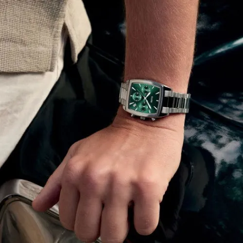 Die Quartaut Chrono-Uhr für Herren besticht durch eine unverwechselbare Mischung aus Stärke und Luxus. Mit einem stromlinienförmigen, silberfarbenen Tonneau-Gehäuse, einem 3-Glieder-Armband aus Edelstahl und einem grünen Zifferblatt mit 3 Hilfszifferblättern. Perfekt geformt, bietet sie …sowohl Komfort als auch Stil. Um das Armband anpassen zu lassen, empfehlen wir Ihnen, Ihren Juwelier vor Ort aufzusuchen.