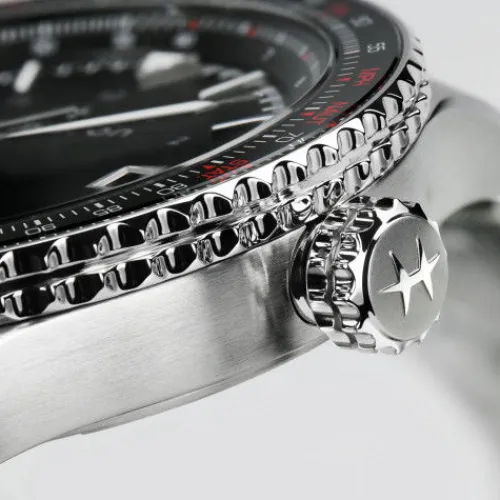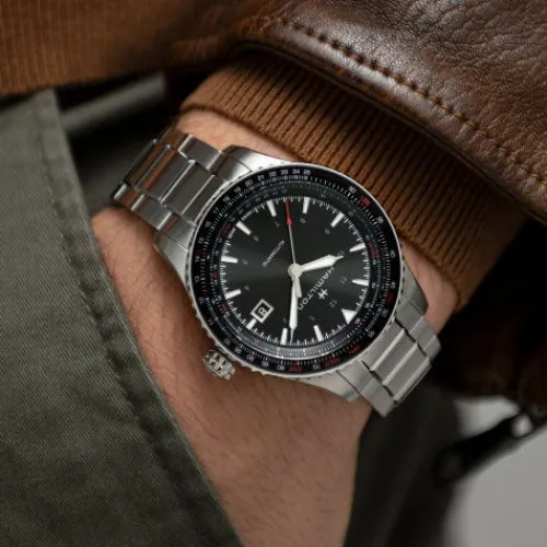 In der Khaki Aviation Converter trifft fortschrittliche Technologie auf edlen Stil. Eine beidseitig drehbare Rechenschieber-Lünette führt wichtige Berechnungen und Umrechnungen durch, und das fortschrittliche neue Material für Spiralfedern, NivachronTM, garantiert Präzision in jeder Umgebung. …Unter dem schlanken schwarzen Zifferblatt mit 42 mm Durchmesser arbeitet das Automatikwerk H-10 mit 80 Stunden Gangreserve – eine perfekte Kombination für moderne Piloten oder urbane Jetsetter.