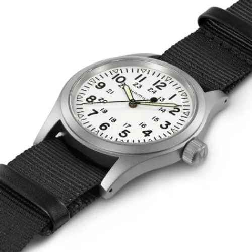 Klein, aber fein: Die Khaki Field Mechanical ist der ultimative Begleiter bei allen Missionen. Das 38-mm-Edelstahlgehäuse besitzt ein in mattem Weiss gehaltenes Zifferblatt mit kontrastierenden schwarzen Indizes und einer Super-LumiNova®-Beschichtung, die für optimale Ablesbarkeit sorgt. Mit …ihrem langlebigen NATO-Armband ist die neue Khaki Field Mechanical eine zuverlässige Neuauflage ihrer Vorgängerin aus den 1960er-Jahren und bleibt dem militärischen Vermächtnis Hamiltons treu.