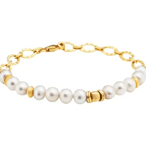 Verleihe deinem Handgelenk einen Hauch von Eleganz mit unserem exquisiten Perlenarmband. Die 12 Süßwasserperlen strahlen natürliche Schönheit aus, während goldene Akzente dem Schmuckstück eine luxuriöse Note verleihen. Jede Perle ist ein Unikat, sorgfältig ausgewählt mit höchster …Qualität. Das zeitlose Design macht es zum perfekten Accessoire für jede Gelegenheit. Trage dieses edle Armband aus vergoldetem Sterlingsilber und setze ein stilvolles Statement – ein Must-have für jede Schmucksammlung. Das Armband ist längenverstellbar.