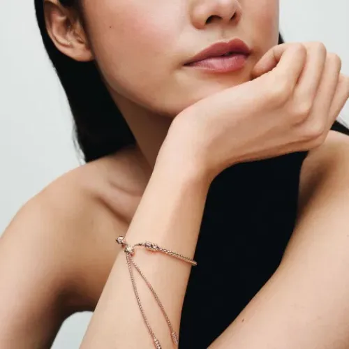Unser Schiebeverschluss-Nietenarmband ist der ultimative, vielseitige Träger, der sich durch seinen Schiebeverschluss auf eine beliebige Länge verstellen lässt. Das rosévergoldete Schmuckstück passt allen Größen. Das Armband hat einen flexiblen Kern für leichte Beweglichkeit und die …verschiebbare Silikonkugel an der schmaleren Kette ermöglicht die Anpassung der Größe, damit du jedes Mal die perfekte Passform einstellen kannst. Gestalte dein persönliches Schmuckstück mit bis zu 10 Charms oder Charm-Anhängern deiner Wahl.