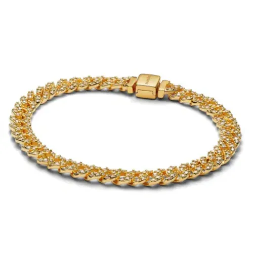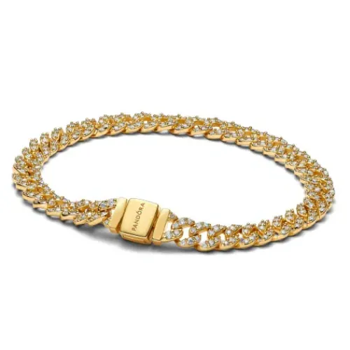 Verleihe deinem Look mit dem Pandora Timeless Pavé Cuban Gliederarmband einen eleganten Touch. Dieses vergoldete Armband verzaubert mit einer funkelnden Gliederkette. Die Oberseite jedes Halbkreises ist mit drei runden Steinen besetzt, während die Rückseite der Kette für noch mehr Glanz und …Komfort poliert ist. Der flache, quadratische Verschluss des Armbands ist mit einem eingraviertem Pandora Logo verziert.