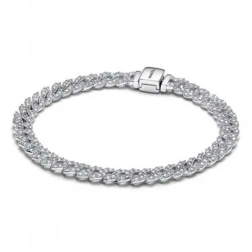 Verleihe deinem Look mit dem Pandora Timeless Pavé Gliederarmband einen eleganten Touch. Dieses Armbands aus Sterling-Silber verzaubert mit einer funkelnden Gliederkette. Die Oberseite jedes Halbkreises ist mit drei runden Steinen besetzt, während die Rückseite der Kette für noch mehr Glanz …und Komfort poliert ist. Der flache, quadratische Verschluss des Armbands ist mit einem eingraviertem Pandora Logo verziert. Dieses Sterling-Silber Kettenarmband kombiniert die lineare Geometrie unserer legendären Ketten mit funkelndem Pavé – ein zeitloses Schmuckstück mit einem modernen Touch.
