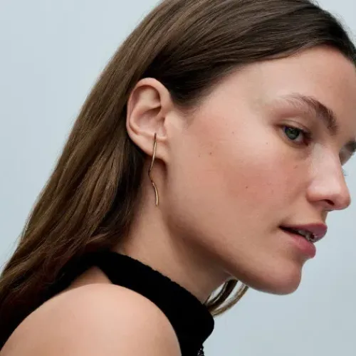 Die Organisch Geformten Draht Ohrringe definieren schlichte Eleganz neu. Ein vergoldeter vertikaler Draht mit einem abgerundeten Profil, das zu beiden Enden hin schmal zuläuft, sorgt für eine wellenförmige, fließende Optik. Der obere Teil des Drahtes ragt leicht über die Ohrläppchen hinaus. …Das gespiegelte Design beim rechten und linken Ohrring sorgt für ein interessantes Detail. Diese Ohrringe sind von Linien und Kurven in der Natur inspiriert – eine originelle Neuinterpretation eines zarten, warmen Ohrstecker-Styles.