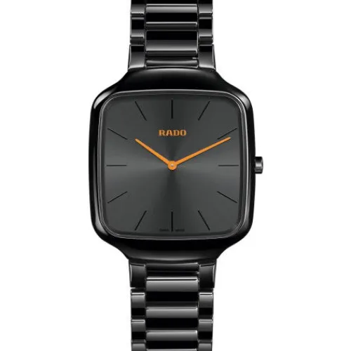 Erleben Sie mit der Rado True Square Thinline das harmonische Zusammenspiel von künstlerischem Ausdruck und Schweizer Präzision. Angetrieben von einem zuverlässigen Rado Quarzwerk vom Kaliber R420 gewährleistet diese Uhr mit müheloser Eleganz eine präzise Zeitmessung. Das 37 mm grosse …Gehäuse schafft das perfekte Gleichgewicht zwischen Stil und Tragbarkeit – damit ist das Modell für jeden Anlass geeignet. Das Gehäuse und die Krone aus polierter schwarzer Hightech-Keramik haben eine kühne und zeitgemässe Ästhetik und verkörpern die Essenz modernen Designs. Mit ihrer Monobloc-Konstruktion und dem flachen Saphirglas strahlt diese Uhr Langlebigkeit und zeitlose Eleganz aus. Das schwarze Ton-in-Ton-Zifferblatt mit Sonnenschliff ist mit im Farbton Sun Orange lackierten Zeigern ausgestattet und mit dem Rado Logo versehen, ebenfalls in Sun Orange. Perfekt komplementiert wird das Gehäuse durch ein mit Präzision gefertigtes Armband aus polierter schwarzer Hightech-Keramik – für einen nahtlos einheitlichen Look.