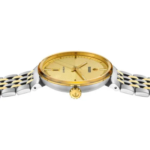 Entdecken Sie mit der legendären Rado Florence die zeitlose Verbindung aus Schweizer Präzision und Eleganz. Das 39 mm grosse Gehäuse der Uhr wird von einem randlosen Saphirglas gekrönt, dessen metallisierter Rand farblich auf das gelbgoldfarbene Zifferblatt abgestimmt ist. Dieses Saphirglas …dient gleichzeitig als schützende Vorderseite und als Lünette in gelbgoldfarbenem PVD, die nahtlos in das Gehäuse integriert ist und so das ikonenhafte und elegante Profil der Florence unterstreicht. Das gelbgoldfarbene Zifferblatt mit seinem eleganten Prägemuster dient als Theaterkulisse und zeugt von viel Liebe zum Detail. Die gelbgoldfarbenen Indizes und das bewegliche Rado Ankersymbol mit gebürstetem und poliertem Finish harmonieren perfekt mit dem gelbgoldfarbenen Hintergrund. Abgerundet wird das Gehäuse durch ein zweifarbiges Armband, das Glieder aus poliertem gelbgoldfarbenen PVD-Edelstahl mit Gliedern aus gebürstetem Edelstahl kombiniert und mit einer Dreifachschliesse aus Edelstahl am Handgelenk gesichert wird. Unter dem Gehäuseboden aus Saphirglas im Box-Shape-Stil verbirgt sich die Seele der Florence: das Automatikwerk Kaliber R763. Das in fünf Lagen fein justierte Uhrwerk mit einer Nivachron™ Spiralfeder bietet eine hohe Ganggenauigkeit und eine robuste Gangreserve von 80 Stunden. Dies unterstreicht den hohen Stellenwert, den Rado der Perfektion beimisst.