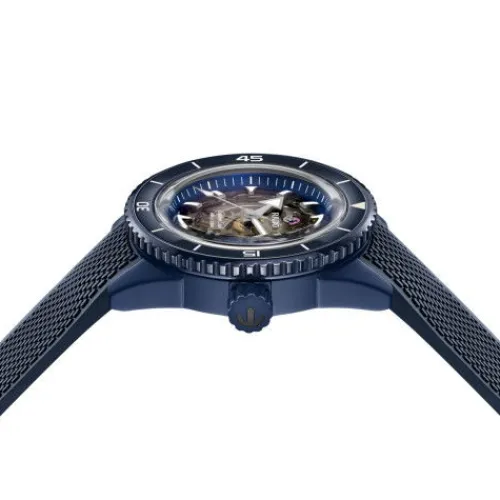 Die Captain Cook High-Tech Ceramic Skeleton stellt ihr innovatives R808 Uhrwerk zur Schau – ein Wunderwerk aus Kontrasten, Know-how und intelligenter Geometrie, das einen klaren Blick auf die verschiedenen Bauteile gewährt. Die Uhr ist mit einer antimagnetischen und höchst zuverlässigen …NivachronTM Spiralfeder ausgestattet, die in fünf Lagen getestet wurde und eine Gangreserve von bis zu 80 Stunden bietet. Ihr edles Monobloc-Gehäuse aus Hightech-Keramik in mattem Marineblau wird durch eine drehbare Lünette aus polierter Hightech-Keramik in Marineblau mit einem marineblauen Keramikeinsatz abgerundet – farblich perfekt und optisch absolut harmonisch auf Gehäuse und Bandanstösse abgestimmt. Das Zifferblatt ist klar und minimalistisch gestaltet und verfügt über markante geometrische Indizes und Zeiger in Rhodiumtönen, die dank Beschichtung mit weissem Super-LumiNova® auch bei schlechten Lichtverhältnissen bestens abgelesen werden können. Mit ihrem farblich abgestimmten Armband aus marineblauem Kautschuk und ihrer Schliessenabdeckung aus Hightech-Keramik zeigt die neue Captain Cook ihre sportliche Seite.