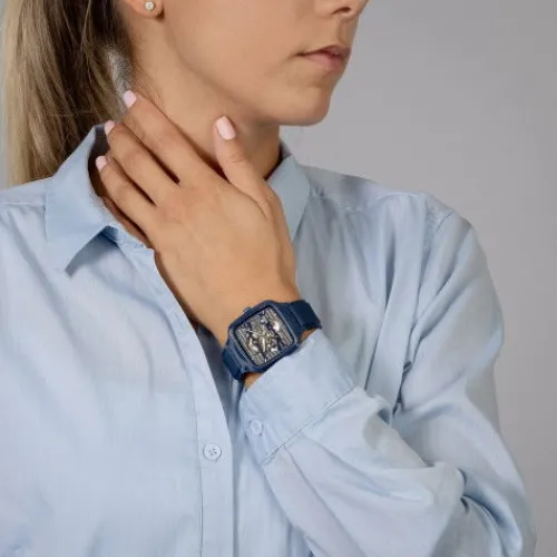 Erleben Sie mit der True Square Skeleton die perfekte Verbindung aus Kunstfertigkeit und Präzision. Was bei ihr sofort ins Auge fällt, sind das skelettierte R808 Uhrwerk und das Zifferblatt mit zwei Ebenen, das praktisch mit dem Uhrwerk verschmilzt. Dieses hochmoderne Kaliber mit einer …Gangreserve von 80 Stunden liefert eine herausragende Präzision, während seine zuverlässige NivachronTM Spiralfeder für eine noch höhere Magnetfeldfestigkeit sorgt. Das skelettierte Zifferblatt verfügt über elegante Indizes und Zeiger in Rhodiumtönen, die dank Beschichtung mit weissem Super-LumiNova® auch bei schlechten Lichtverhältnissen bestens abgelesen werden können. Mit ihrem 38 mm grossen Monobloc-Gehäuse aus polierter marineblauer Hightech-Keramik und ihrem marineblauen Kautschukarmband bietet die True Square Skeleton typische Rado Merkmale in einer faszinierenden Form.